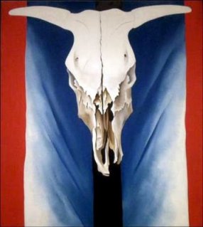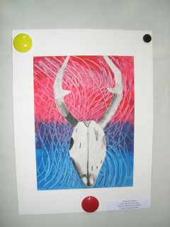 I know many art teachers do O’Keefe’s flowers, but I really find her skulls to be visually striking. I had the students paint the background using tempera and create implied textures using plastic cards that had different notches cut off of them. I saw this tip from Painted Paper blog. Then on a new sheet we drew a deer skull from observation. Talked about values, shadows, and proportion. Below is a student example.